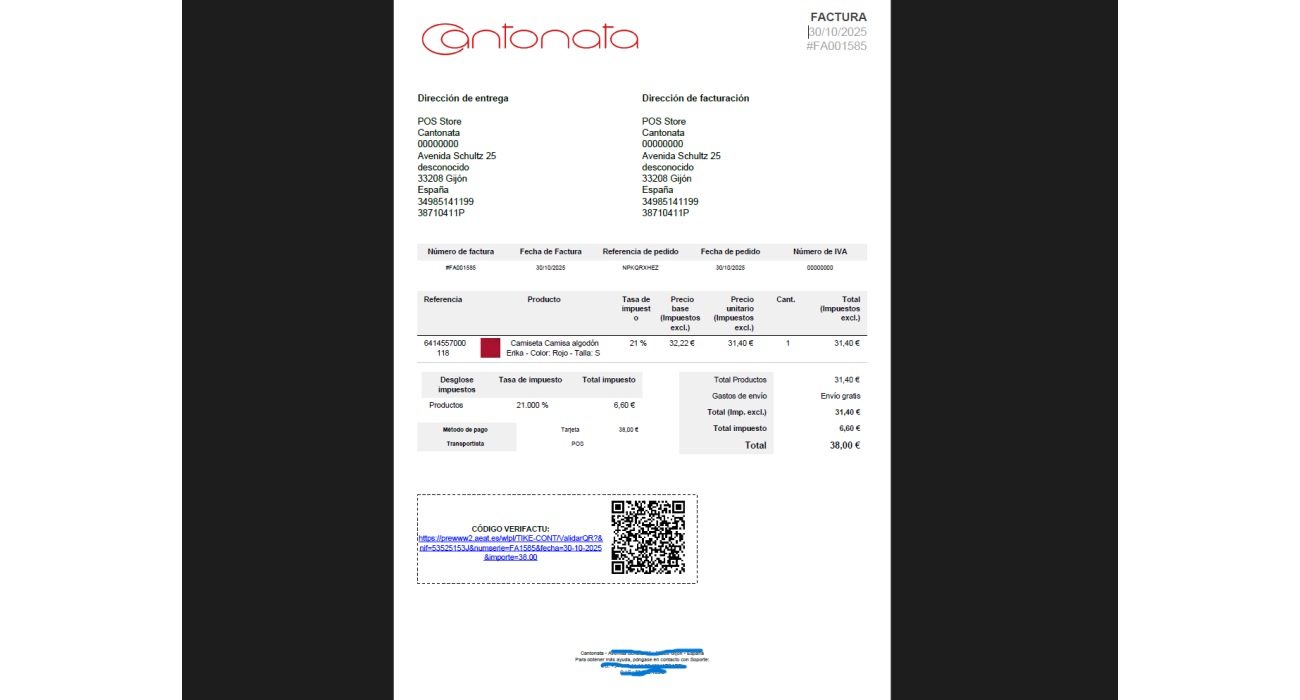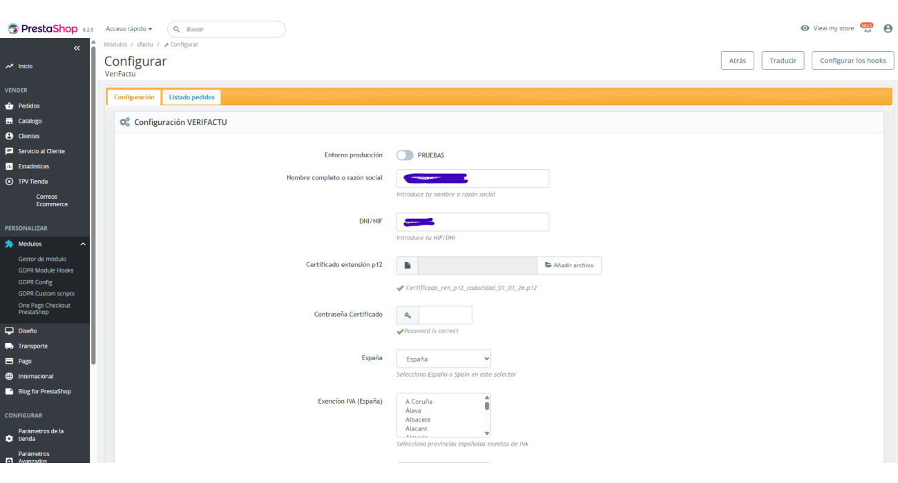 Este módulo se instala en su tienda y cada vez que genera una factura enviar un alta a hacienda, el código QR verifactu se incluye en la factura simplificada o factura permitiendo comprobar su alta. Estos registros van autenticados electrónicamente por lo que necesita un archivo de firma electrónica y su contraseña.